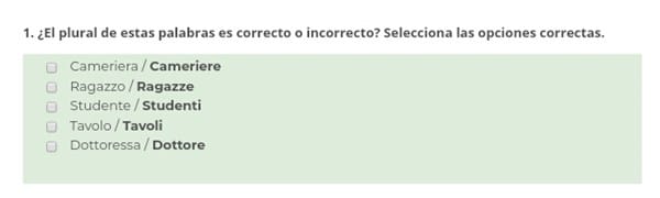 Idiomas Anónimo el 8 ago. 19 ITALIANO Resolver ejercicio de plural de italiano Necesito resolver este ejercicio de italiano. Hay que saber cua es correcta o incorrecta Seguir Siguiendo Dejar de seguir
