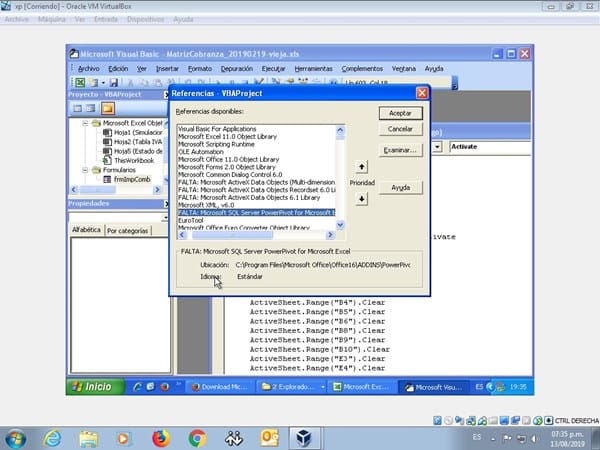 Hola, la empresa que nos dio el archivo nos comento que funcionaba en windows 10 y office 2010 y 2013, hice una virtual de windows 2010 pro 32bit y office plus 2010 32bit, he instale vb 6.0 msdn 6.0 power pivot 2010, pero que va sigue enfocando el mismo error, te paso la imagen y en referencia no muestra que falte algo.