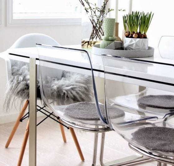 Mi salón consta de mesa comedor de madera blanca, ¿mesa auxiliar pequeña de metacrilato transparente y tengo un escritorio de cristal negro (q necesito en el salón) tengo q comprar sofá y mueble que tonos me aconsejáis? El salón está pintado en blanco