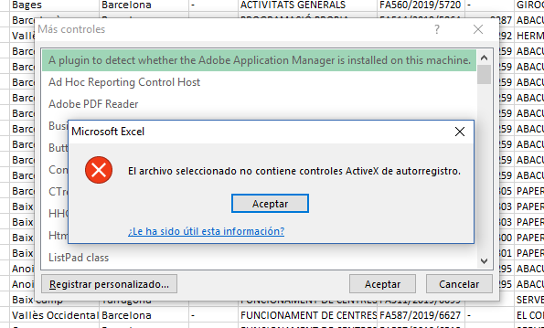 Me he bajado el archivo lo que cargado en la ruta C:\Windows\System32, he ido al excel y en desarrollador -> insertar -> más controles -> registrar personalizado y he cargado el archivo mscomctl.ocx y me dice esto.