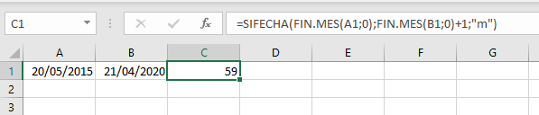 Necesito de su grandísima ayuda para hacer el calculo de los meses que han transcurrido entre 2 fechas tomando en cuenta incluso el mes inicial y el mes final sin tomar en cuenta los días, por ejemplo de 20/05/2015 al 19/04/2020 me debe de dar 60, necesito el numero por que requiero usar ese dato paro otros cálculos, da igual si es con macro o con fórmula.