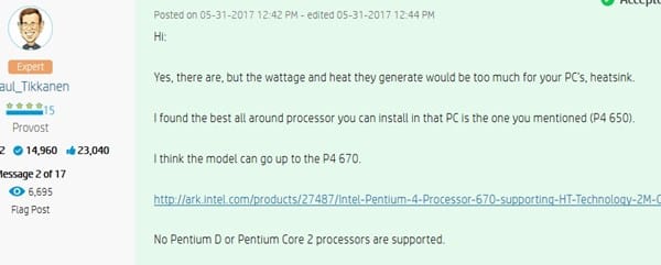 De acuerdo a lo que aportan los compañeros de la comunidad HP, es un Pentium 650 (3,4 Ghz, 2Mb de Caché, 64 Bits) el procesador más potente que admitiría la placa base de su equipo, es muy buen procesador, incluye un Hyperthreading mejorado respecto a los Pentium 4 anteriores, función que en cierta forma, convierte a este micro en un doble núcleo, los dos Mb de Caché y el generoso bus frontal de 800 Mhz, lo hacen ser quizás el procesador de mayores prestaciones en el año 2005, si exceptuamos a la familia Pentium D, aunque estos sólo consistian en dos procesadores Pentium 4 520 a 2,8Ghz (32 Bits) unidos en un sólo encapsulado de una forma un tanto rudimentaria, que provocaba que el procesador rindiese por debajo de su capacidad teórica, o dicho de otra forma, como un doble núcleo al uso (más reciente, igual que los primeros CoreDuo),