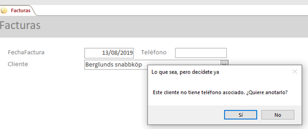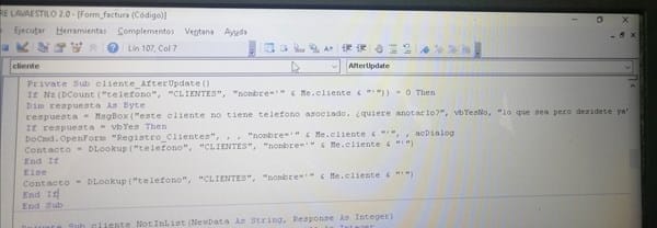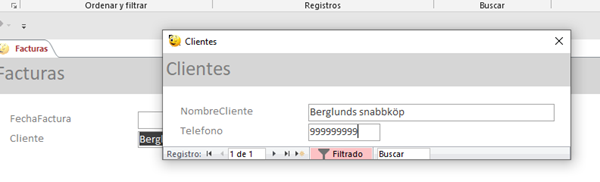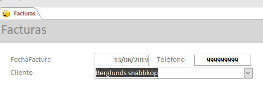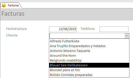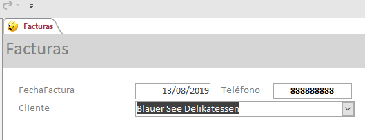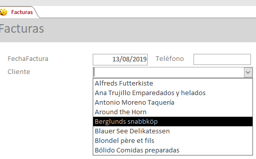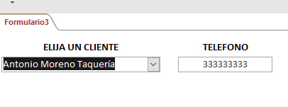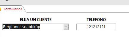 Tengo un formulario llamado factura en el cual tengo un cuadro combinado que esta lleno de los clientes previamente registrados en la tabla clientes esta tabla tiene los compos cliente y número de teléfono ademas de fecha etc etc