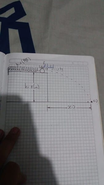 Esto te da la cantidad de energía que recibirá la masa de 1.50 Kg ... de allí la transferís a Energía cinética de lanzamiento...= 1/2 m V^2 ....y despejas V... que seria Vx del lanzamiento. Desde aquí la masa cae libremente según y.