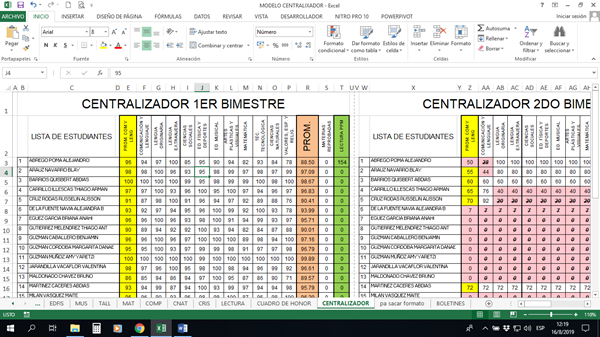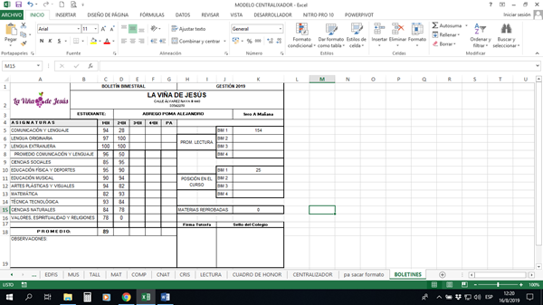 - Mi sincera sugerencia es que te des el trabajo de tener TODO en una sola hoja dividida por campos exactos tipo: Código de alumno, Nombre, Grado/Año, Asigantura/Curso, Nota, Bimestre. Y nada más. Teniéndolo así todo, sería fácil llenar los boletines tan solo usando BuscarV, e incluso proemdios y otros hasta con Tablas Dinámicas.