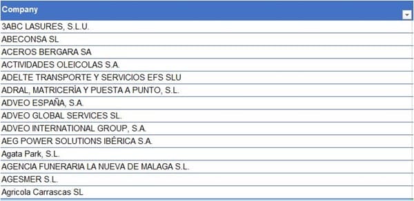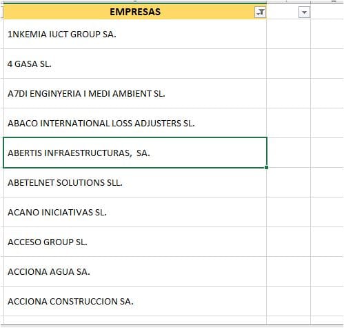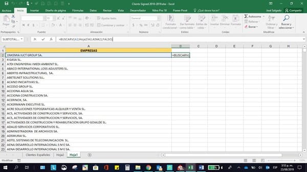 Tengo dos archivos en excel que tienen nombre de empresas, quiero saber que nombres están en ambos archivos. Adjunto un recorte de los dos archivos, cada uno tiene más de 100o registros. Aprecio vuestra ayuda