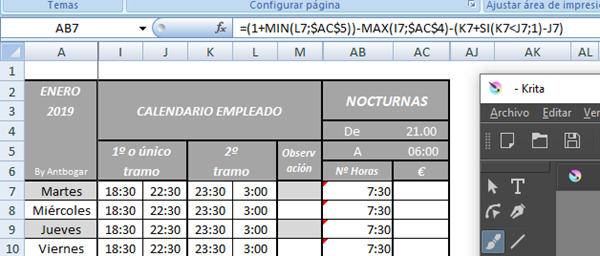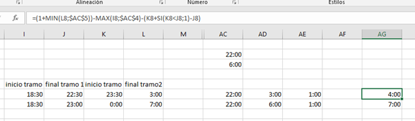 Primero disculparme por hacer de nuevo una pregunta sobre este tema pero todo lo que encuentro no me funciona o los enlaces a los que me reenvía no funcionan. Tengo hecha una hoja en la que figura el horario de trabajo, es uno turno partido en el que todas o parte de las horas trabajadas están dentro del tramo considerado, horas nocturnas.