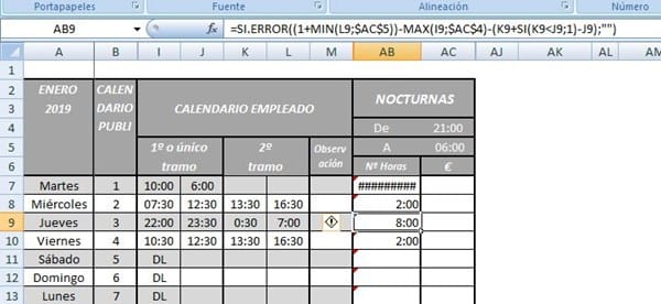 En la celda AC4 esta asignada la hora de inicio a partir de la cual se considera nocturna, las 22:00