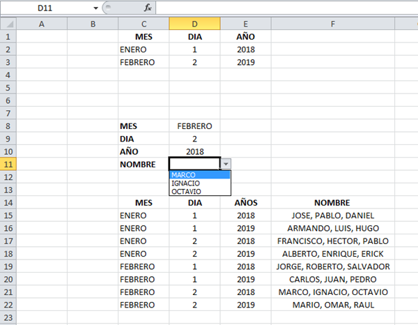 Supongamos que en una celda válido los datos para permitir una lista que contenga: "nombre de niños", "nombre de niñas" y en otra celda me despliegue una lista en función de lo que seleccione en la primer lista. Es decir, si seleccione "nombre de niños", en la segunda lista me despliega: "juan", "carlos", luis. Pero si en la primer lista seleccione "nombre de niñas", en la segunda lista me despliega: "laura", "sofia", "Elena"