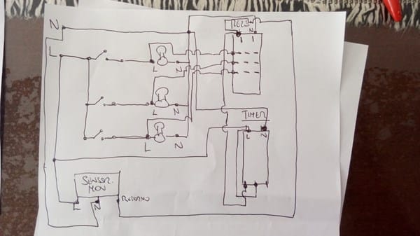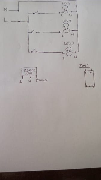 Como podría agregar a este circuito un timer para encenderlas todas juntas hasta determinado horario (por ejemplo las 12 de la noche) y además un sensor de movimiento que las encienda también a todas juntas en caso de que se abra este sensor y este fuera del rango de operación del timer.? ¿Sin perder la independencia del encendido por llave individual de cada una?