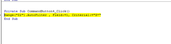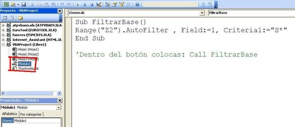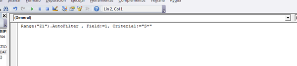 Sub FiltrarBase() Sheets("hoja3").Range("Z2").AutoFilter , Field:=1, Criteria1:="S*" End Sub