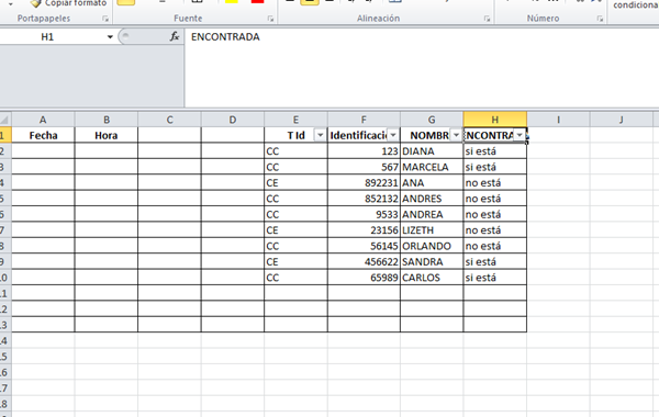 En la columna H se puede observar un "no esta" y un "si esta". Deseo a través de VBA al presionar un botón de CommandButton me realice la acción de filtrar la columna H por los que "si están".