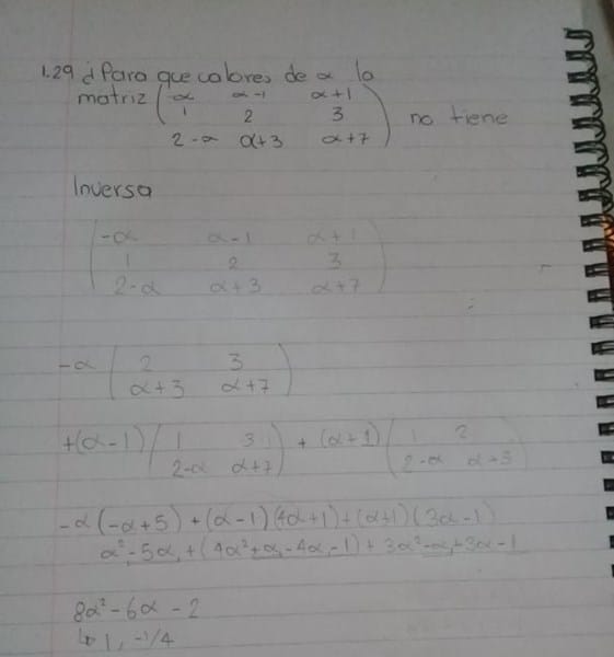 Entonces concluyo que para que no sea inversa |A|=8α^2-6α-2, α=1y α-1/4. Y para que sea inversa α en R - {1,-1/4}