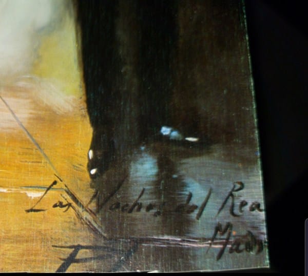 Bue nas tardes, he encontrado este cuadro en el trastero y me ha resultado curioso porque al intentar descubrir quién lo pintó, resulta que está cortado. Tenía un precinto en la parte posterior que ponía " atención al precinto". ¿Alguien puede ayudarme? Por favor y gracias, de antemano.