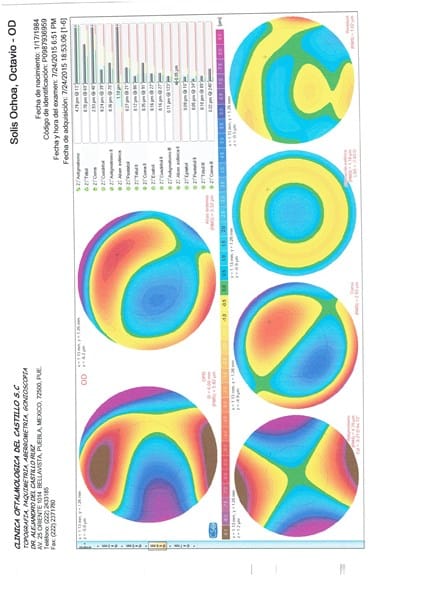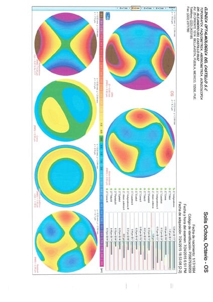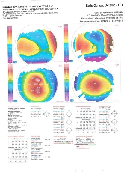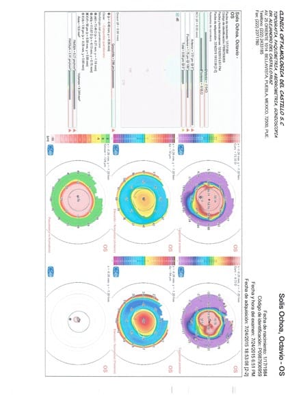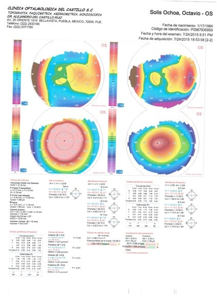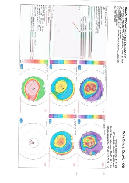 ¿Seria posible que alguien pudiera interpretar unos estudios oftalmológicos? Son de mi esposo de un problema de queratocono que tiene, la cosa es que el medico no nos quiso interpretar los estudios para una carta que necesita para el seguro, Ojala alguien me pudiera ayudar. Dejo a a continuación el escáner del Primer estudio (son dos )