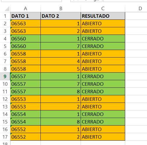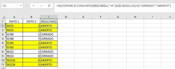 Tengo dos campos a los cuales necesito generar una condición ("RESULTADO"). En la columna A existen datos que se encuentran agrupados, o menor dicho que se repiten. En la columna B son datos que se encuentran relacionados con la columna A. La idea es que si un dato de la columna B es menor o igual a 7, y relacionado con cada dato que se repite en A me indique que está "CERRADO" o "ABIERTO" y me entregue en resultado en la columna C.