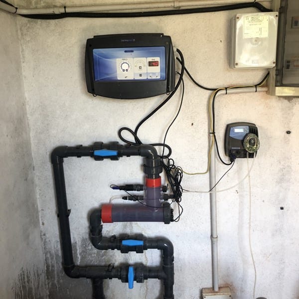 Primero, no se que marca y modelo es tu clorador salino pero que pongas los inyectores de ácido y los sensores todos juntos en la salida del clorador ya me da muy mala espina, sin hablar de la posición que tiene el propio clorador salino, pues me parece totalmente forzada y me atrevería a decir, sin miedo a equivocarme, que errónea.