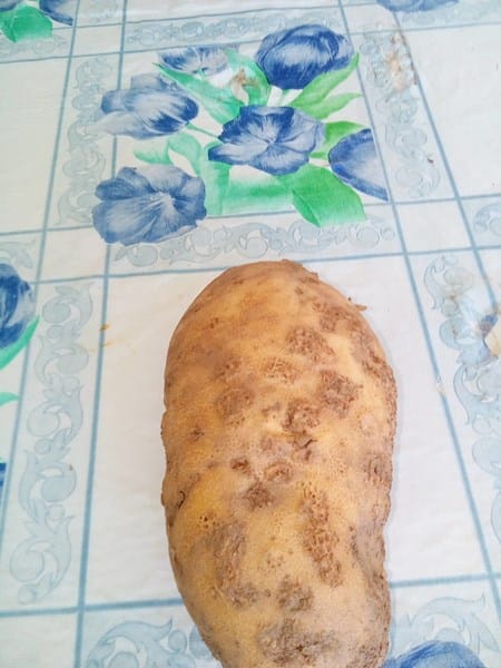 La simiente de patatas, la saco de una gruesa limpia y lisa, la parto en tantos trozos como tallos tiene. O sea no siembro una entera. Al recolectar me encuentro que gran parte de la cosecha tiene arrugas. Creo que se llaman " Roña"