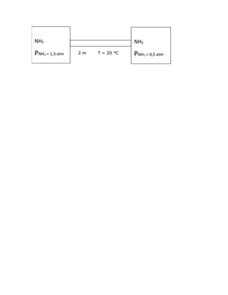 En un tubo de 2 m de largo se difunde amoníaco gaseoso en nitrógeno gaseoso a la presión de 1 atm y a 20 °C. Al principio del tubo la presión del amoníaco es de 1,5 atm y en el final del tubo la presión es de 0.5 atm: la difusividad del amoníaco en nitrógeno a esa presión y temperatura es de 0,15 x 10-4 m2/ s. Calcular el flujo de amoniaco y nitrógeno en el tubo.