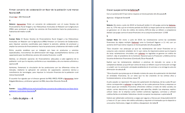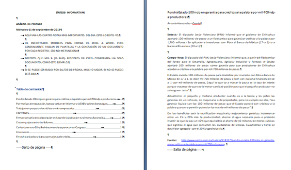 También cuento con un ejemplo del documento final, donde cada registro va ordenado: "Título" en letra 14 y nivel de esquema 1 (para hacer la hermosa tabla de contenido), "Colaboradores" en cursiva y letra 12, "Resumen" o Síntesis, "Nota completa" o Cuerpo Nota y "Fuente" con el respectivo hipervínculo.