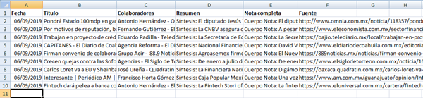 Cuento con una base de datos con los campos requeridos en columnas: Fecha, Título, Colaboradores, Resumen, Nota completa y Fuente.