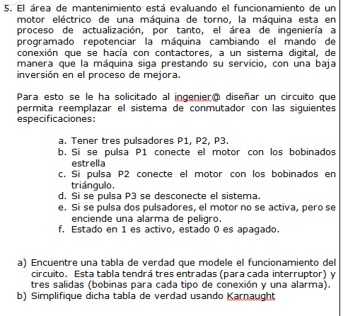 - El área de mantenimiento está evaluando el funcionamiento de un motor eléctrico de una máquina de torno, la máquina esta en proceso de actualización, por tanto, el área de ingeniería a programado repotenciar la máquina cambiando el mando de conexión que se hacía con contactores, a un sistema digital, de manera que la máquina siga prestando su servicio, con una baja inversión en el proceso de mejora.
