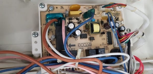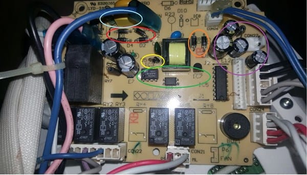 He comprobado otro enchufe, he revisado a simplevista las conexiones y con multímetro llega corriente bien al botón de encendido, y de este salen los 220v correcto hasta la placa. En la placa también ahí un fusible que esta bien. Los condensadores también se ven en buen estado, ni inflados ni reventados.