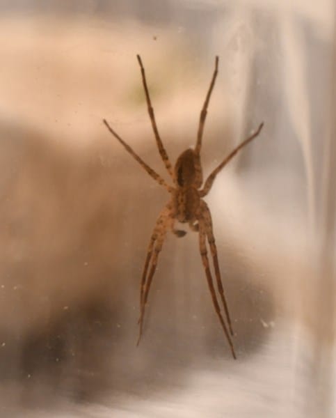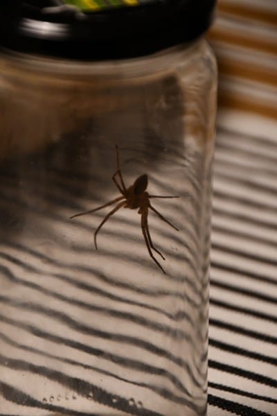 MI hijo ha encontrado en el techo de su cocina una araña y, tras cogerla en un bote de cristal, la ha soltado en el jardín de su casa.