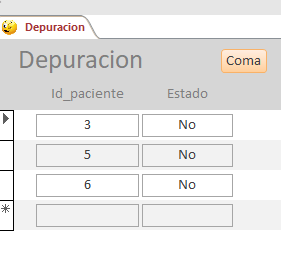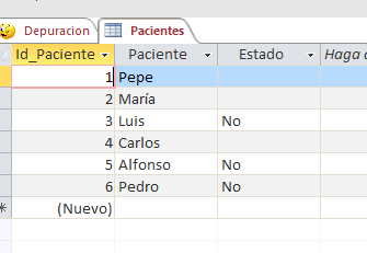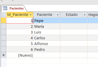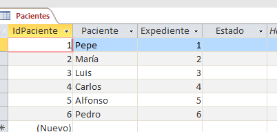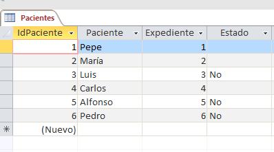 Tengo la tabla Pacientes, en la cual existe el campo Expediente (que va de 1 a N) y otro campo llamado Estatus (que se encuentra vacía)