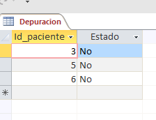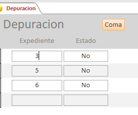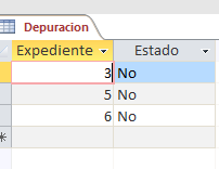 En otra tabla Depuración, tengo lo mismo Expediente (solamente con ciertos números) y el otro campo Estatus (que encuentra lleno con un NO)
