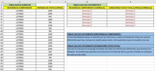 Mediante fórmulas se debería generar una segunda tabla que me visualice todas las referencias diferentes que tengo en el almacen y me muestre el total de litros que han entrado de cada una de ellas.