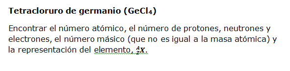 Tetracloruro de germanio (GeCl4)Encontrar el número atómico, el número de protones, neutrones y electrones, el número másico (q