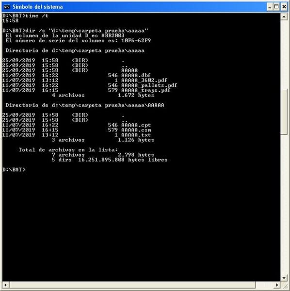 En este primer pantallazo te muestro el contenido de la carpeta origen (d:\carpeta prueba) y su única subcarpeta (d:\carpeta prueba\AAAAA) que siguen los nombres que me has indicado y el de la carpeta destino que no tiene nada.