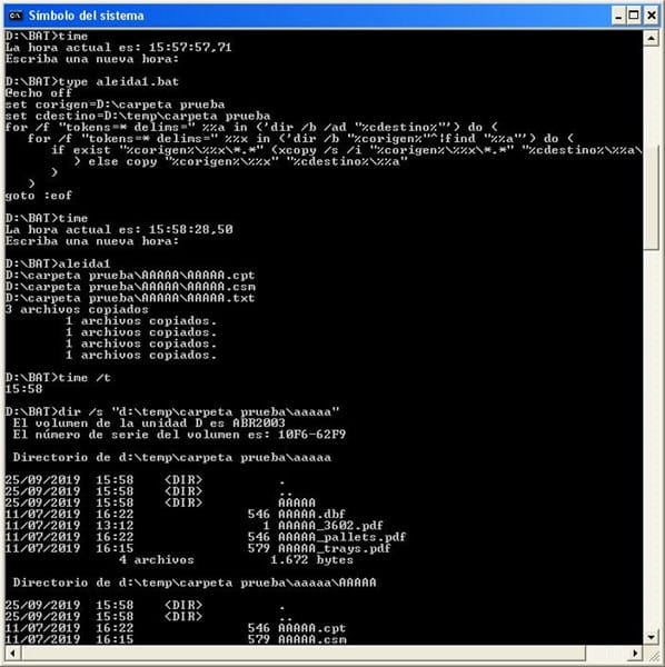 En este segundo pantallazo te muestro el BAT (aleida1.bat), los mensajes de copia que provocan la ejecución del BAT y el nuevo contenido de la carpeta destino y de su única subcarpeta (creada ahora).
