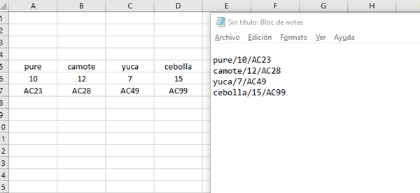 Tengo 3 filas (5,6,7) en excel y esta tiene muchas columnas (varia el numero) alguna ayuda para poder tener un bloc de notas que me anide por columna las filas con un separador de "/" y los ponga en el bloc de notas como muestro en el imagen, por favor alguna ayuda para realizar este proceso. Muchas Gracias.