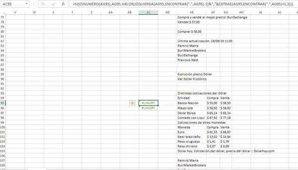 Extraigo datos desde la web para tener actualziado el precio dolar, pero al momento que actualiza, me cambia el formato y los resultados me dan error, intente con esta fórmula