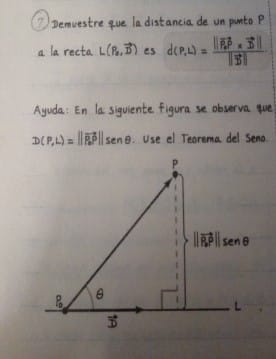 $$\begin{align}&d(P,L)=\left\|\Pr_{\vec{D}^\bot}\overrightarrow{P_0P} \right\|\\&\\&d(P,L)=\dfrac{\left|\overrightarrow{P_0P}\cdot \vec D^\bot\right|}{\left\|\vec D^\bot\right\|}\\&\\&d(P,L)=\dfrac{\left|\overrightarrow{P_0P}\cdot \vec D^\bot\right|}{\left\|\vec D\right\|}\\&\\&\text{Sabemos que si }\theta \text{ es el ángulo entre }\vec D\text{ y }\overrightarrow{P_0P} \text{ entonces:}\\&\\&\cos(90°-\theta) = \dfrac{\overrightarrow{P_0P}\cdot \vec D^\bot}{\|\overrightarrow{P_0P}\|\cdot \|\vec D^\bot\|}\\&\\&\sin\theta = \dfrac{\overrightarrow{P_0P}\cdot \vec D^\bot}{\|\overrightarrow{P_0P}\|\cdot \|\vec D^\bot\|}\\&\\&\overrightarrow{P_0P}\cdot \vec D^\bot = \|\overrightarrow{P_0P}\|\cdot \|\vec D^\bot\| \sin \theta\\&\\&\overrightarrow{P_0P}\cdot \vec D^\bot = \|\overrightarrow{P_0P}\|\cdot \|\vec D\| \sin \theta\\&\\&\overrightarrow{P_0P}\cdot \vec D^\bot = \left\|\overrightarrow{P_0P}\times \vec D\right\|\\&\\&\text{Por fin}\\&\\&\boxed{d(P,L)=\dfrac{\left\|\overrightarrow{P_0P}\times \vec D\right\|}{\left\|\vec D\right\|}}\\&\\&\end{align}$$