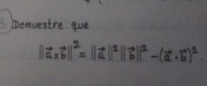 $$\begin{align}&\left\|\vec a \times \vec b\right\|=ab\sin\theta~~~~\cdots~\textit{($\theta$ es el ángulo entre los dos vectores)}\\&\\&\left\|\vec a \times \vec b\right\|^2=a^2b^2\sin^2\theta\\&\\&\left\|\vec a \times \vec b\right\|^2=a^2b^2(1-\cos^2\theta)\\&\\&\left\|\vec a \times \vec b\right\|^2=a^2b^2\left[1-\left(\dfrac{\vec a\cdot \vec b}{ab}\right)^2\right]\\&\\&\left\|\vec a \times \vec b\right\|^2=a^2b^2-(\vec a\cdot \vec b)^2\end{align}$$