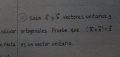 Sean a y b vectores unitarios y ortogonales .pruebe que (a producto cruz b) curz a es un vector unitario