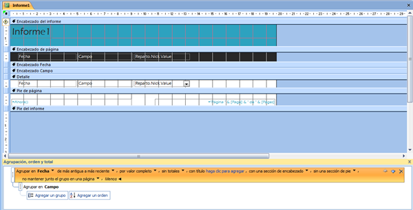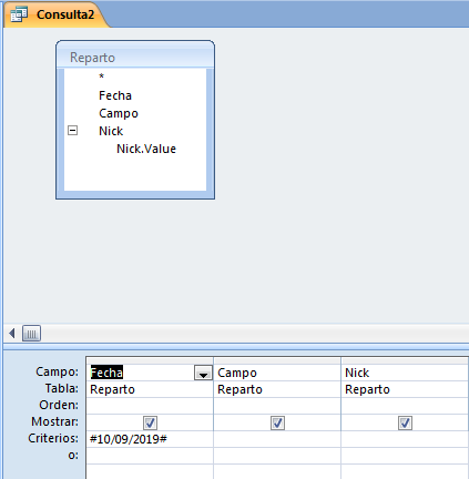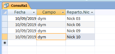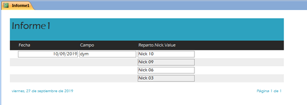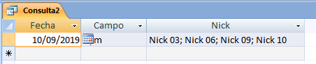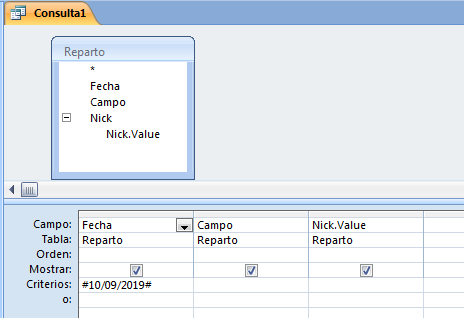 Si en la fecha 10/10/2010 con un solo registro en la tabla "Reparto" selecciono en el campo "Nick" siete nombres existentes, la consulta me mostrara siete registros con los tres campos. La idea es que muestre lo mismo pero si la fecha es la misma en los siete "Nick" seleccionados que solo la muestre en el primero y así con todos los registros introducidos en la tabla "Reparto".