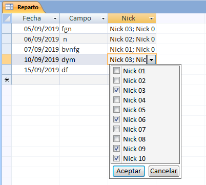 La tabla en cuestión se llama Reparto y es una tabla muy pequeñita que solo tiene 3 campos. El primer campo es "Fecha", el segundo campo de texto y el tercer campo es "Nick" con un asistente para búsquedas con la opción activada de varios valores y que tira de otra tabla que solo contiene un campo "Nicks" como clave principal.