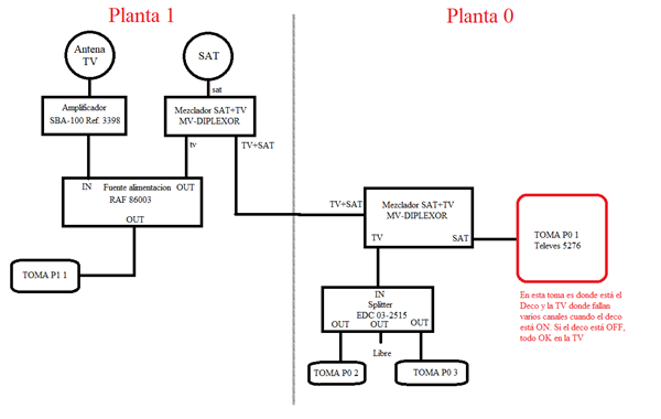 Si enciendo un deco que está en la toma sat+tv que está marcada en rojo. La TV que está en esa misma toma comienza a fallar. Simplemente fallan algunos canales o directamente no se ven, otros canales no se ven afectados.