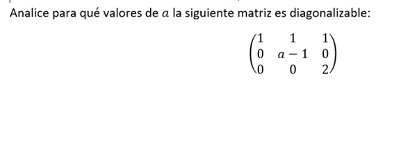 Hola expertos, me pueden dar una mano para resolver la siguiente matriz, necesito el calculo para los valores de a que hacen diagonalizable la matriz.