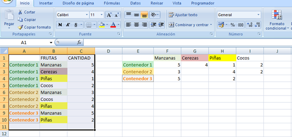 2. Agrupar los tipos de frutas que se repiten en filas