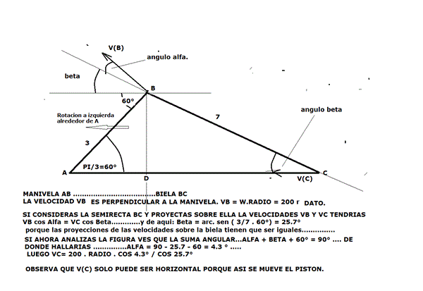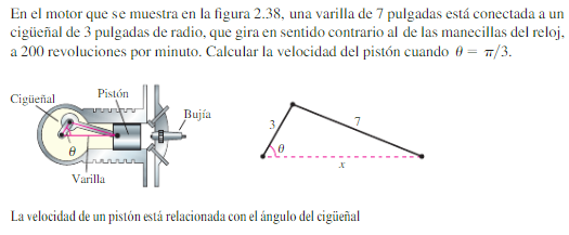Una varilla de 7 pulgadas está conectada a un cigüeñal de 3 pulgadas de radio, que gira en sentido contrario al de las manecillas del reloj, a 200 revoluciones por minuto. Calcular la velocidad del pistón cuando el θ= π/3