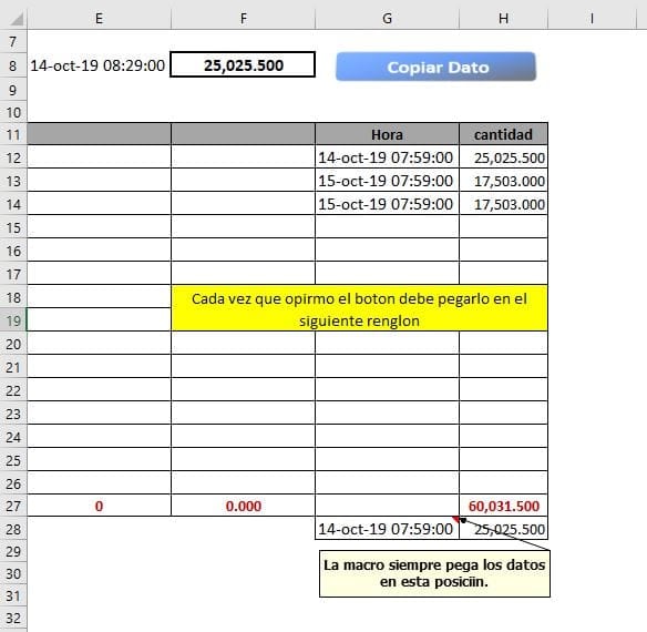 Tengo un dato en A1 y B1 (los dstos van cambiando) quiero con botón copiar esos datos y pegarlos en F2 y G2,. Cuando cambien los valores oprimir el botón y pegar kos dstos en F3 y G3, Así ir a la siguiente fila cuándo los pegue