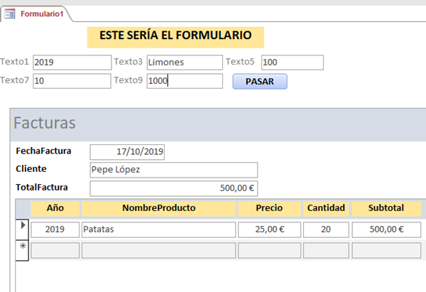 El problema es que una vez dados los valores en el Formulario emergente y trasladarlos al Subformulario con código, no consigo que me grabe el registro, salvo que lo haga yo de forma manual. Os pongo el código: