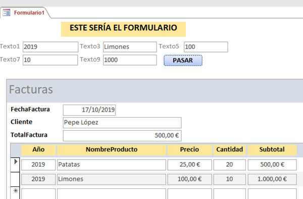 '*******Toma de datos******** Var_Año = Me![Año] Var_Id_Expediente = Me![Id_Expediente] Var_Id_Inventario = Me![Id_Inventario] Var_Id_Presupuesto = Me![Id_Presupuesto] Var_Id_Subpresupuesto = Nz(DMax("Id_Subpresupuesto", "Subpresupuestos", "[Año] = " & Var_Año & " And [Id_Expediente] = " & Var_Id_Expediente & " And [Id_Inventario] = " & Var_Id_Inventario & " And [Id_Presupuesto] = " & Var_Id_Presupuesto & ""), 0) + 1 Var_Id_Plantilla_Presupuesto = Me![Id_Plantilla_Presupuesto] Var_Tipo_Presupuesto = Me![Tipo_Presupuesto] Var_Descripcion = Me![Descripcion] '********Rellenar datos Presupuesto********** Forms![Formulario_Expedientes]![Subformulario_Presupuesto].Form![Subformulario_Subpresupuestos].Form![Año] = Var_Año Forms![Formulario_Expedientes]![Subformulario_Presupuesto].Form![Subformulario_Subpresupuestos].Form![Id_Expediente] = Var_Id_Expediente Forms![Formulario_Expedientes]![Subformulario_Presupuesto].Form![Subformulario_Subpresupuestos].Form![Id_Inventario] = Var_Id_Inventario Forms![Formulario_Expedientes]![Subformulario_Presupuesto].Form![Subformulario_Subpresupuestos].Form![Id_Presupuesto] = Var_Id_Presupuesto Forms![Formulario_Expedientes]![Subformulario_Presupuesto].Form![Subformulario_Subpresupuestos].Form![Id_Subpresupuesto] = Var_Id_Subpresupuesto Forms![Formulario_Expedientes]![Subformulario_Presupuesto].Form![Subformulario_Subpresupuestos].Form![Orden_Impresion] = Var_Id_Subpresupuesto Forms![Formulario_Expedientes]![Subformulario_Presupuesto].Form![Subformulario_Subpresupuestos].Form![Tipo_Presupuesto] = Var_Tipo_Presupuesto Forms![Formulario_Expedientes]![Subformulario_Presupuesto].Form![Subformulario_Subpresupuestos].Form![Descripcion] = Var_Descripcion DoCmd. RunCommand acCmdSaveRecord