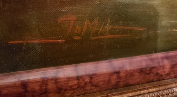 Hola este cuadro me lo han regalado no hace mucho, es un cuadro q se ve por el color del lienzo q es bien antiguo y necesito saber autor, fecha de creación, valor, tiene una firma en la parte inferior izquierda que esta dudosa por la caligrafía extraña de la letra pero creo que dice TMA o algo así, les mando una foto de la firma también