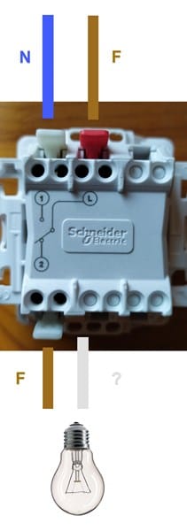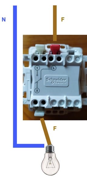 ¿Quizás el cable azul, neutro, no pasa por el interruptor sino que va conectado directamente al casquillo de la bombilla, y el cable marrón, F, si que entra en el interruptor por donde pone L y sale por la parte que pone 2? ¿Es correcto? Si es correcto, por favor, confirmádmelo.